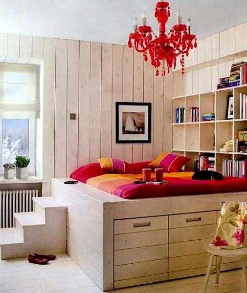 В небольшой комнате следует избавиться от всевозможных полочек и тумбочек, которые тут и там расставлены по периметру. Уж если вы решились на вариант кровати с «чердаком», то нужно быть последовательным – выбираем максимально вместительную кровать, которая совмещает функции и спального места, и гардероба. В противном случае ваша комната будет выглядеть захламленной и неуютной.