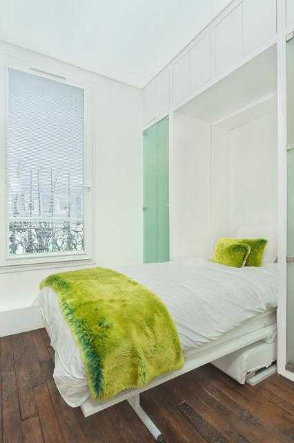 Что если спрятать кровать в шкаф? Приобрести такую модель давно не проблема. Кстати, площадь этой квартиры всего 6 метров! За зелеными дверцами спрятаны шкаф и маленький, но такой нужный душ.