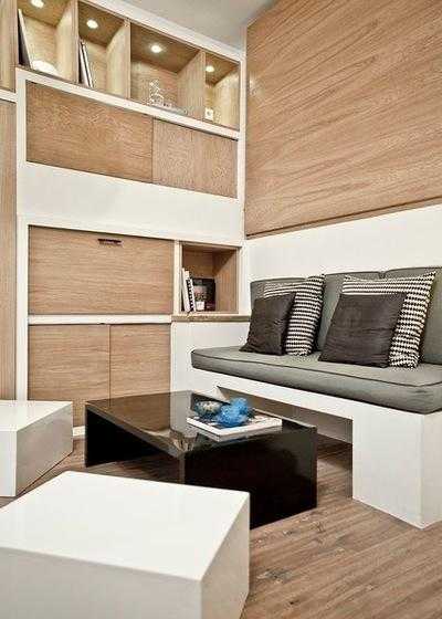 Другой вариант кровати, притворяющейся стеной, выбрали для микро-квартиры девочки-студентки. Спальное место откидывается, словно верхняя полка в поезде. В шкафу прячется рабочий стол, а под диваном — столик и пуфы.