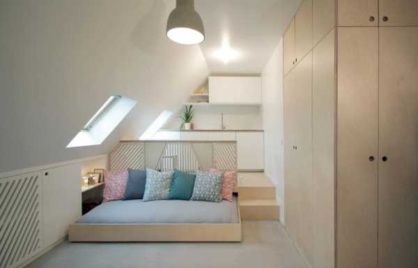 Чтобы конструкция не казалась слишком громоздкой, дизайнеры интерьеров предлагают выполнять ее ступенчатой – на одной ступени можно расположить рабочий стол, на второй кровать. Ступень под кроватью может получиться настолько высокой, что внутри легко расположится полноценная гардеробная.