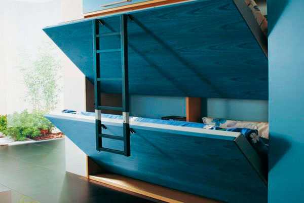 Существуют откидные модели двухъярусных кроватей. Спальные места легко трансформируется в другую конструкцию. Такой вариант очень удобен, т.к. освобождает дополнительную площадь для детских игр и развлечений. Обратная сторона кровати может служить магнитной доской или выполнять другую полезную функцию.