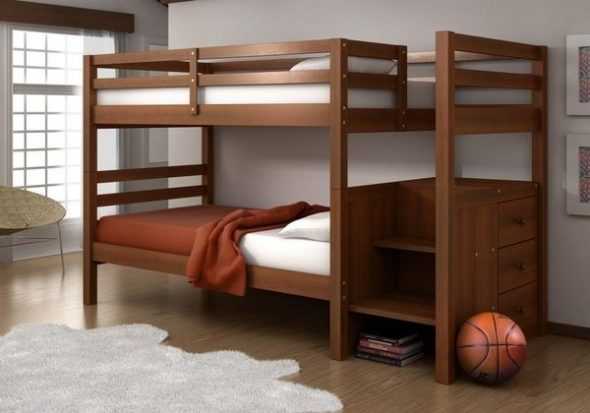 - безопасность — если второй ярус предназначается для ребенка, он непременно должен иметь ограничительный бортик высотой не менее 30 см. Кровать не должна иметь острых углов, торчащих болтов, скрепок, тогда дети не поранятся во время сна или игр. Лестница на второй ярус должна иметь удобные поручни. Чтобы малыш не оступился, перекладины лестницы не должны быть слишком редкими. Оптимальным вариантом выступит лестница, которую можно приставлять с разных боков конструкции. Это позволит приспособить кровать к параметрам конкретной комнаты. Если пространство помещения позволяет, то лучше выбрать модель с выдвижными ящиками под лестницей. Это дополнительное место для хранения вещей ребенка;