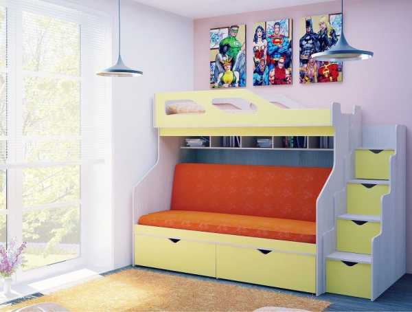 Можно выбрать вариант для двух детей. У таких конструкций роль первого яруса выполняет диванчик, который раскладывается в спальное ложе при необходимости. Такую конструкцию можно применить в маленьких однокомнатных, где нужно организовать сон и для взрослых, и для ребенка.
