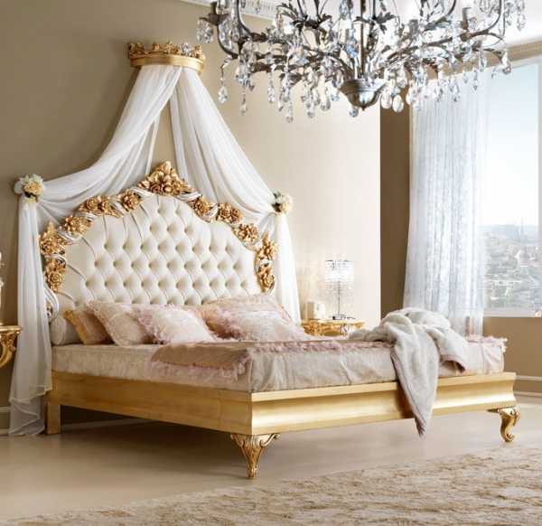 - роскошные изголовья в стиле барокко оформляются шелком, гобеленом, обрамлены фигурными позолоченными рамами. Такие изголовья задают тон всему интерьеру и требуют поддержки другими элементами декора. Более строгий, но не менее дорогой, стиль ампир также характеризуется дорогой отделкой – шелком и бархатом в сочетании красного, синего и белого с золотом;
