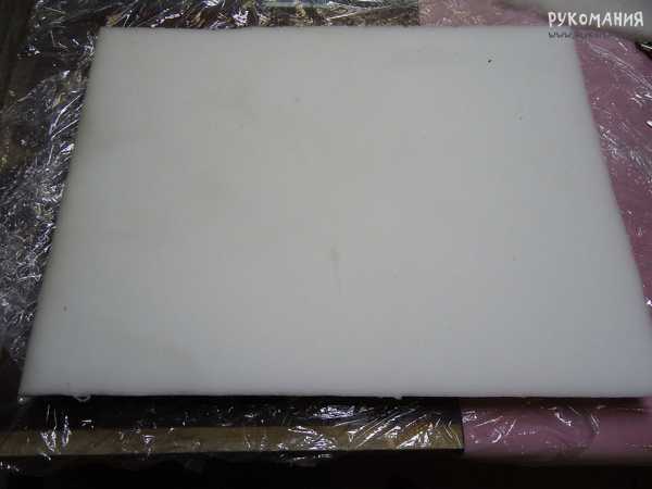 Вырезаем поролон под размер нашей заготовки, резать можно ножницами или острым ножом. Приклеиваем поролон к оргалиту или прихватываем степлером в нескольких местах.
