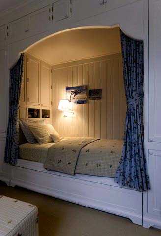 Уютная кровать в нише – альков фотоМногие из нас в детстве мечтали о создании уютного уголка в квартире, где вы сможете отвлечься от всех проблем и погрузиться в сказку. С такой кроватью вы сможете, задернув занавеску или ширму погрузиться в собственный мир. Использование идей с кроватью в нише внесет в вашу комнату креативность и поможет обратить внимание гостей. Установка спального места в нише использовался еще в пятнадцатом веке и после этого, такой вариант применяют и в наше время. Популярность кровати в нише расползлась по всему миру. Такое место поможет создать эффект интимности и будет смотреться достаточно привлекательно и оригинально.