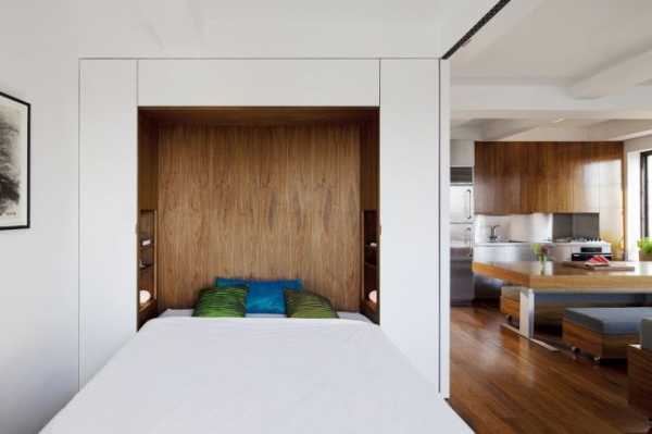 На фото интерьер квартиры студии и складная кровать в деревянной нише.