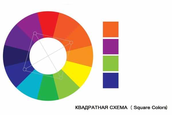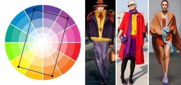 Попробуйте вписать в круг Иттена геометрическую фигуру – прямоугольник и квадрат. В квадратной схеме берите 2 или три похожих цвета. Если вы возьмете разные, то вы рискуете выглядеть нелепо. К примеру, у вас может получиться четырехцветное созвучие из таких цветов: фиолетовый, синий с зеленым оттенком, желтый и красный с оранжевым оттенком.