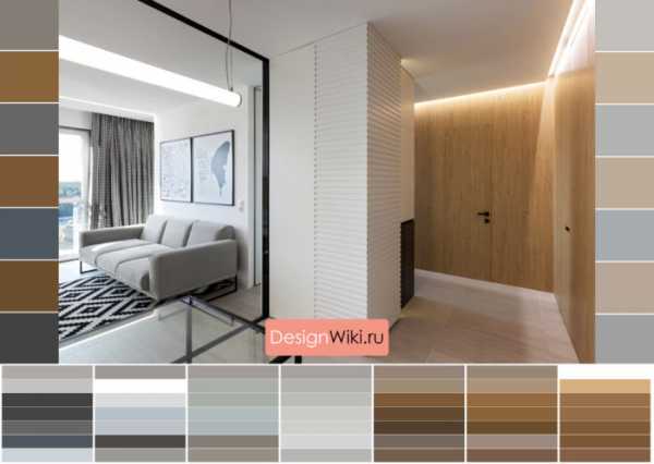 Из базовых использованы белый, серый, чёрный, несколько оттенков коричневого дерева. Как акцентный выбран грязно-синий. Выглядит круто.