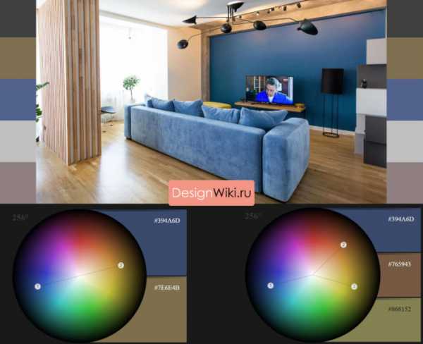Проверяем на соответствие теории (поменял структуру и теперь она дальше). Раскладываем интерьер на цветовую схему и подбираем сочетающиеся цвета для грязно-синего двумя способами. По комплиментарным для двух и трёх цветных комбинаций (ссылка на сервис и пояснения в следующем пункте).