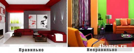 Яркие акцентные цвета следует добавлять чем угодно, но не отделкой. Не надо делать сами стены или ещё хуже потолок агрессивными, так дизайн не делается. Мебель, ковры, картины, всякие подушки, шторы и аксессуары — ими делаются акценты. Их легко добавить и убрать. Отделку оставьте в естественных тонах.