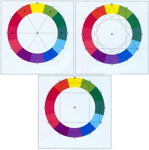 Существуют разные типы сочетания цветов и каждому типу соответствует своя геометрическая иллюстрация на круге.