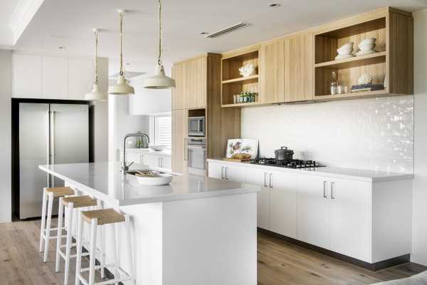 Остров с варочной панелью или мойкой нуждается в хорошем освещении. Декоративная полка над островом дополнит его в дизайнерском плане.