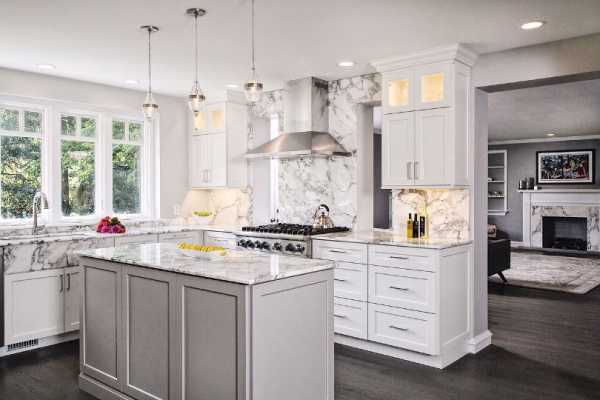 - белые интерьеры не перегружать сложными формами островов. Здесь лучше ограничиться простым гарнитуром. А яркий акцент можно сделать на стенах и декоративных элементах.