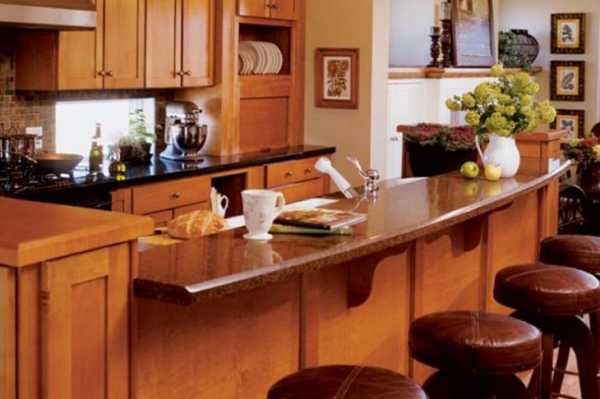 Барная стойка. Не часто встретишь барную стойку на кухне, но многие о ней мечтают. Барная стойка может быть узкой и служить разделителем пространства между кухни и столовой, либо иметь ширину полноценного стола, отличаясь от него лишь высотой.
