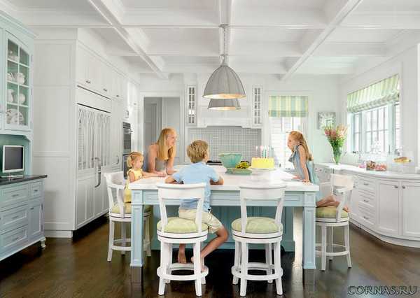 - Посадочные места/зона для детей. Если размеры вашей кухни позволяют, или, к примеру, она совмещена с гостиной или столовой, кухонный стол-остров станет местом приема гостей при званом обеде и вы не волнуетесь о том, где их усадить. Круглые большие или прямоугольные классические острова кухни, их разная высота/размеры — отличный вариант для малышей. Они здесь — новые мамины блюда в поглощении и торжество/другой праздник.