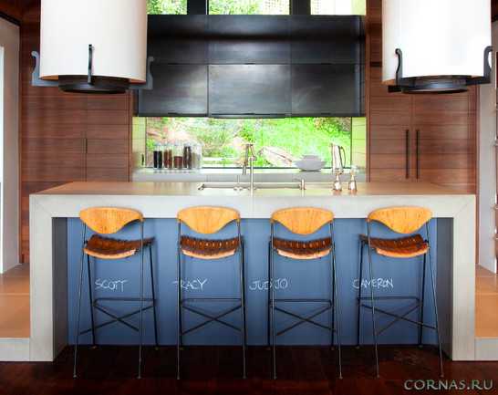 Правда следует отметить то, что если остров имеет стандартную высоту кухонного гарнитура, на обычных стульях за ним сидеть будет не удобно, так как он будет выше обыкновенного обеденного стола. Ситуацию исправят высокие стулья, лучшим вариантом при этому будут барные стулья. Они не только повысят комфорт за обедом, но и украсят интерьер кухни, ведь они всегда имеют весьма эффектный дизайн.