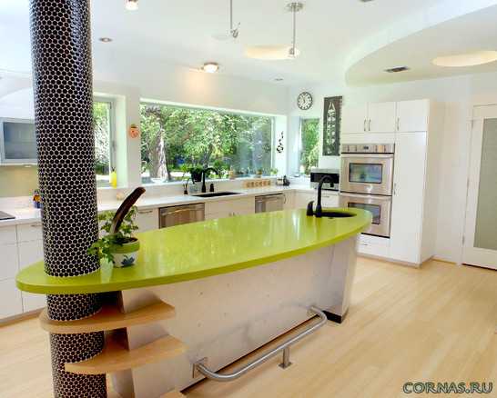 Остров может быть любой формы, как стандартной — квадратной или прямоугольной, что подходит больше для кухонь в классическом стиле. Или же круглой, овальной и другой формы. Чем больше размер самой кухни, тем причудливее и необычнее может быть остров.