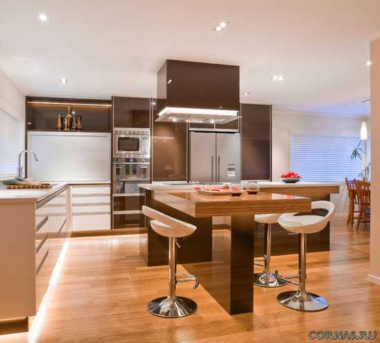 Особенно эффектно будет смотреться кухня с барной стойкой на острове в кухне совмещенной с гостиной. Тогда она будет не просто местом для приготовления пищи, а настоящей красивой комнатой для отдыха, которое будет позволять собирать не только большую семью, но и большие дружеские компании.