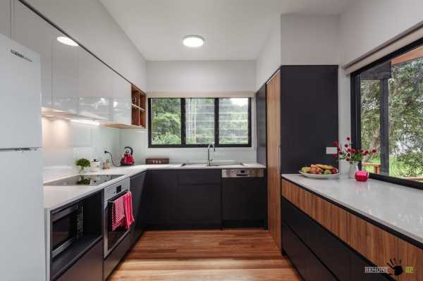 Это компромиссный вариант, объединяющий в себе достоинства углового и параллельного размещения мебели в кухне. Чаще всего он применяется в достаточно широких помещениях, однако допустимо использовать такую расстановку и в небольших кухоньках.