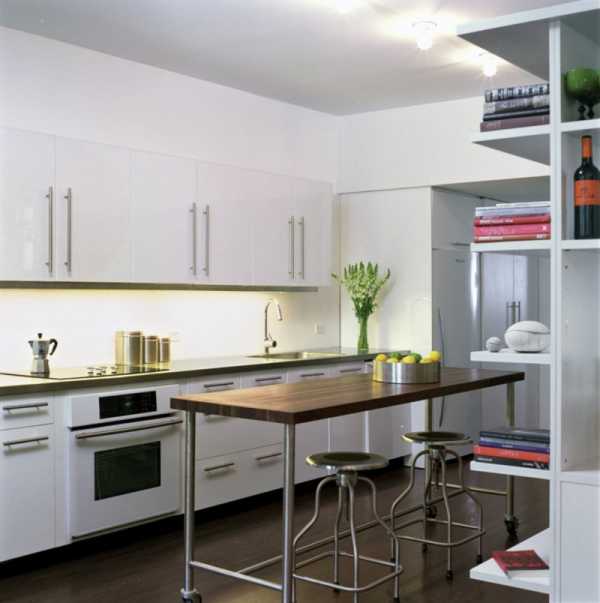 Идеальным решением для узких кухонь является самая распространенная линейная планировка, позволяющая работать одновременно нескольким людям, не мешая друг другу.