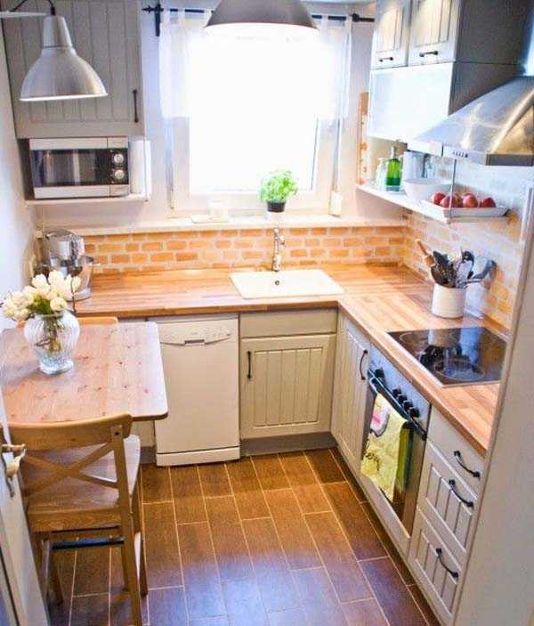 Для маленькой кухни с окном, можно установить столешницу вместо подоконника, таким образом вы сэкономите место.