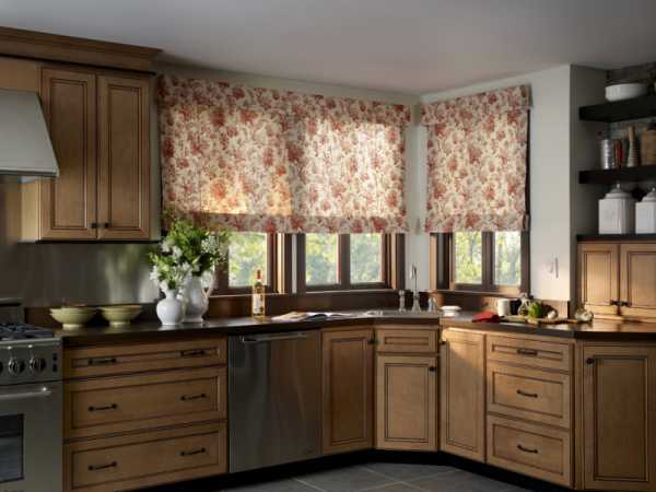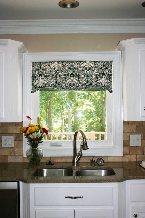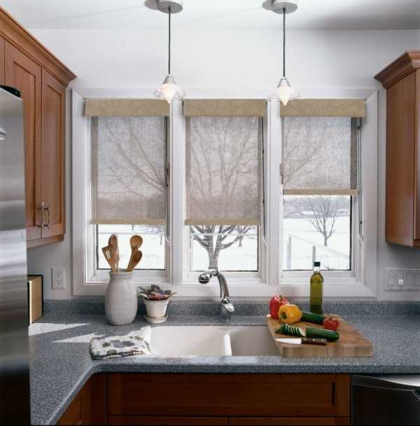 Второй момент. Многие хозяйки волнуются, какие шторы вешать на окно. Не будут ли они мешать над мойкой. Выходов несколько.
