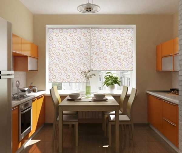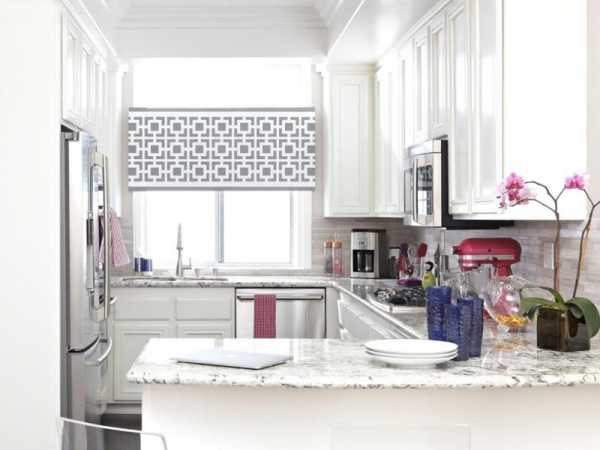 Что касается декоративного оформления окна, то лучше ограничиться лаконичными жалюзи, римскими шторами или ролетами. Не стоит использовать классические занавески или тем более шторы. Важно что-бы материал из которого сделаны шторы было легко стирать или вытирать, особенно если у окна вы планируете расположить плиту.