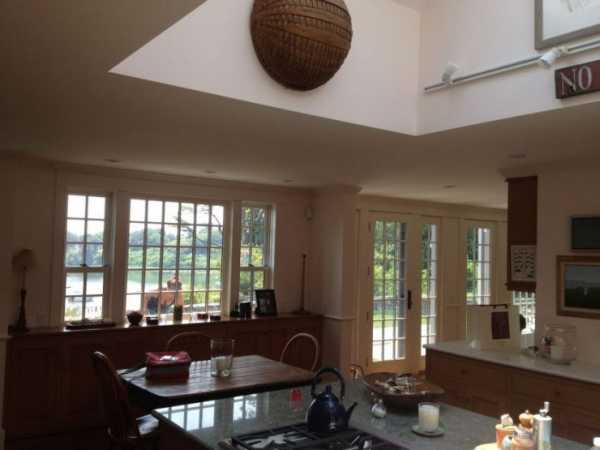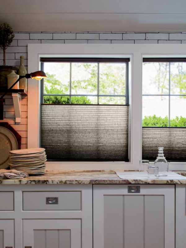 Подумайте также над декорированием окон. Если рядом находится мойка или другая рабочая поверхность, то хорошим вариантом будут так называемые защитные жалюзи. Они легко моются, а также защищают кухню с большим окном от загрязнения и посторонних глаз.