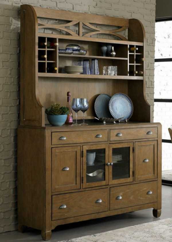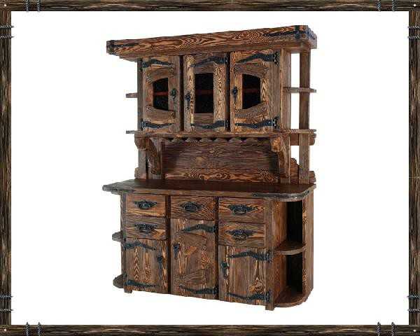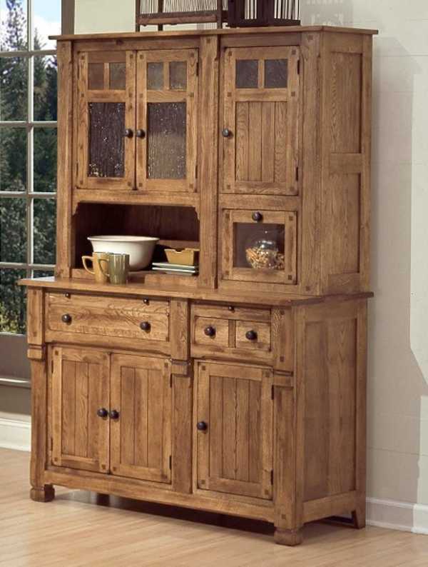 - Для кухни в кантри стиле подойдет простой буфет, который выполнен из необработанной древесины с множеством шкафчиков. Не требуется вычурной отделки.