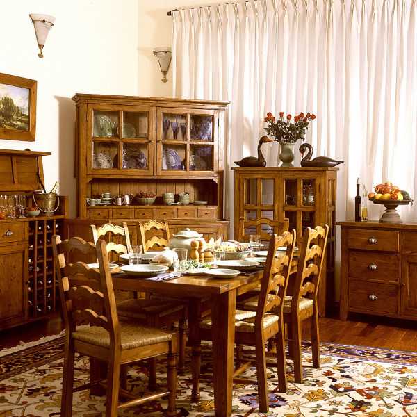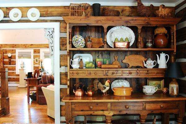 - Кантри-стиль можно подчеркнуть громоздким, массивным и нарочито грубым буфетом с большим количеством функциональных ящичков, полочек и мест для хранения.