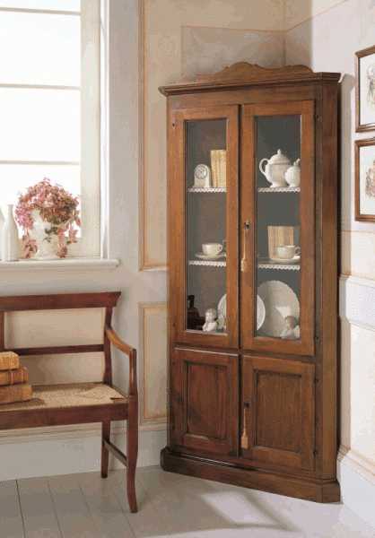 Классическая угловая модель серванта состоит из двух частей: нижней, закрытой дверцами, верхней, имеющей вид застекленной витрины. Это сложное для самостоятельного изготовления изделие, так как имеет множество деталей, в том числе замысловатой формы. Главная особенность предмета – возможность задействовать угол, который ранее пустовал.