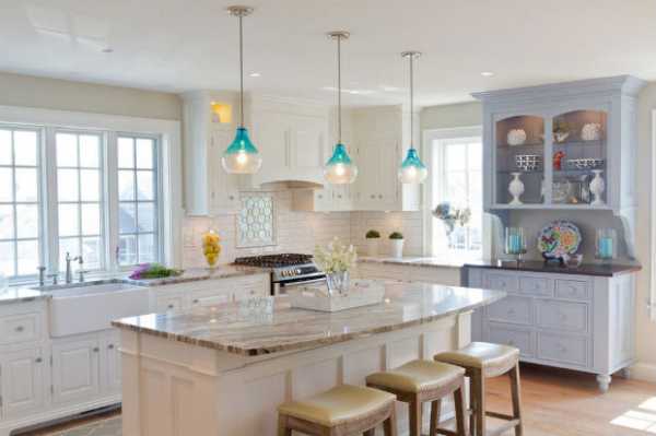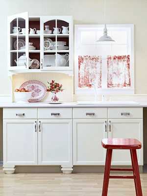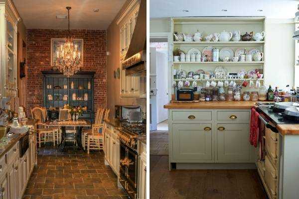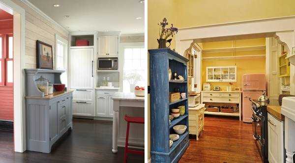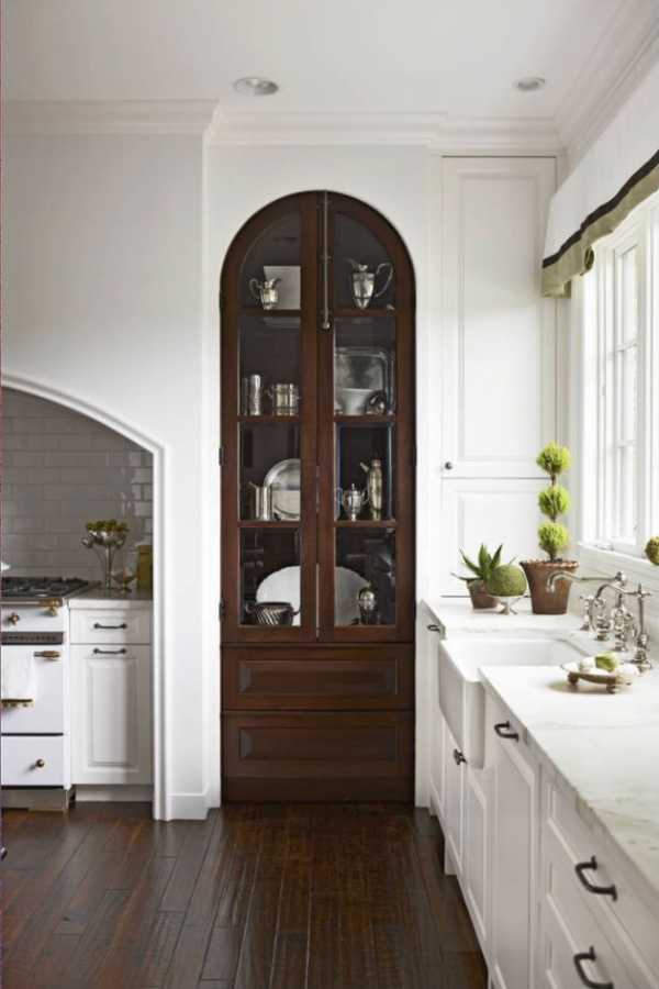 Шкаф буфет идеально подойдет для кухни в стиле прованс или кантри, даже если его цвет не будет совпадать с остальными кухонными шкафчиками. Верхние полки буфета могут быть использованы для хранения чашек, декоративных тарелок, баночек для специй, чайных коробок и разных аксессуаров. Вместительные полки внизу прекрасно подойдут для больших кухонных принадлежностей, таких как банки с крупами, кастрюли и сковородки. Чтобы буфет вписывался в обстановку наилучшим образом, его лучше покрыть такой же столешницей, что и на остальных нижних шкафчиках кухни. Старинные шторы и настенный декор помогут завершить очаровательный дизайн кухни в провинциальном духе.