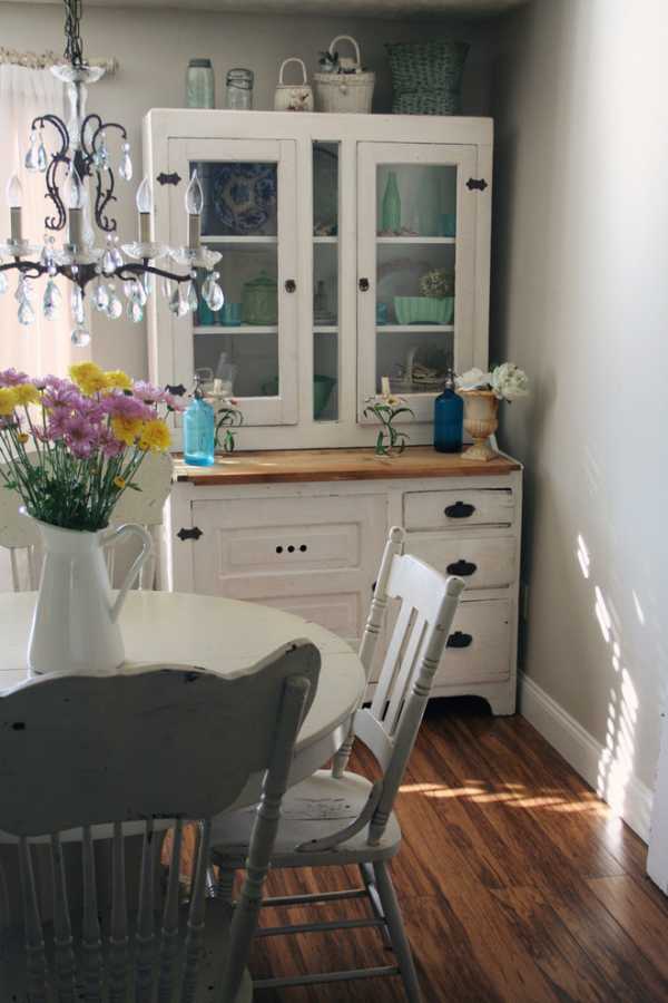 - Шебби-Шик отлично воспримет появление крашенного белого серванта с намеренно оставленными легкими потертостями. В идеале этот буфет должен быть бабушкиным, ну или купленным на распродаже, чтобы в его оформлении чувствовался особый шарм тех времен.