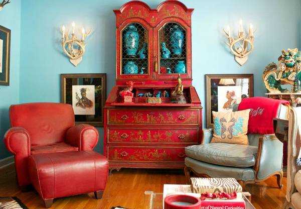 Яркий сервант буфет может стать сердцем вашей гостиной. Используйте верхние открытые полки для хранения своего любимого сервиза, коллекции фарфора или элитного алкоголя. Нижние полки пригодятся для скатертей, диванных подушек и других принадлежностей. На разделительной столешнице будут прекрасно смотреться подсвечники, декоративные вазы и рамки с фотографиями. Но в отличие от кухни, здесь лучше избегать избыточного количества вещей и ограничиться только самыми любимыми предметами.