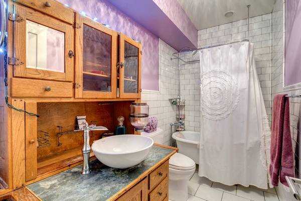 Какой вариант вам больше нравится: старинный буфет в роли тумбы под умывальник или же в качестве шкафа для хранения полотенец и других ванных принадлежностей?