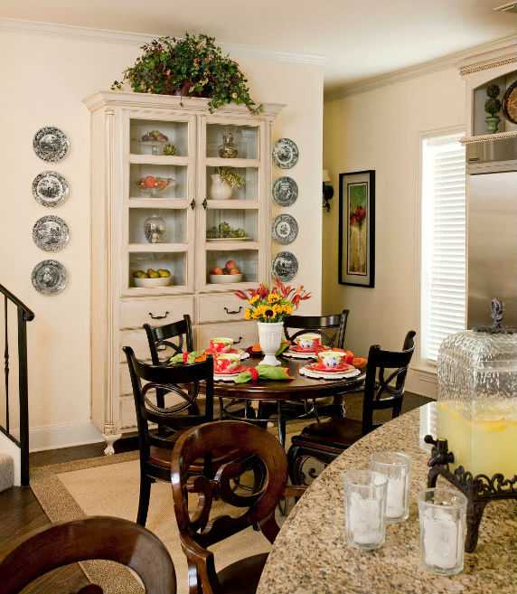 - В просторной кухне место буфета – в столовой зоне или недалеко от входа на кухню. Этот вариант предпочтителен, поскольку заставляет вошедшего обращать внимание не только на сам шкаф, но и на его содержимое.