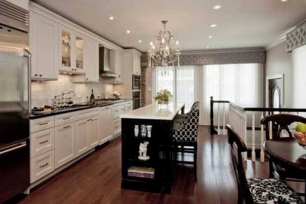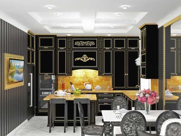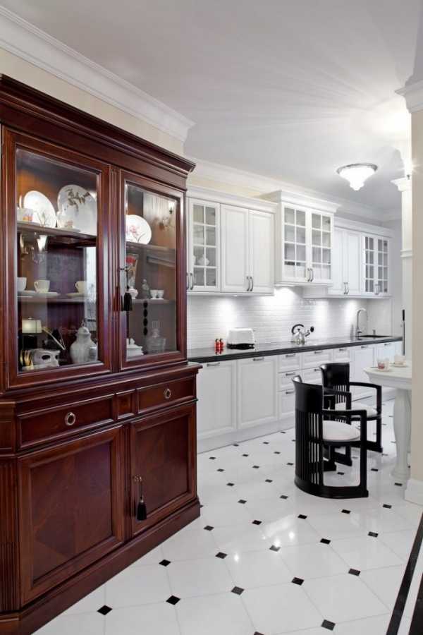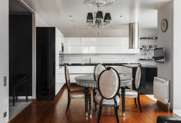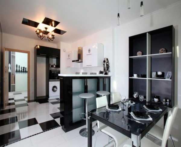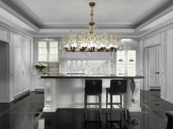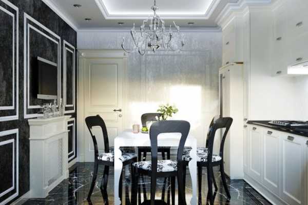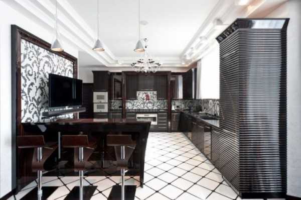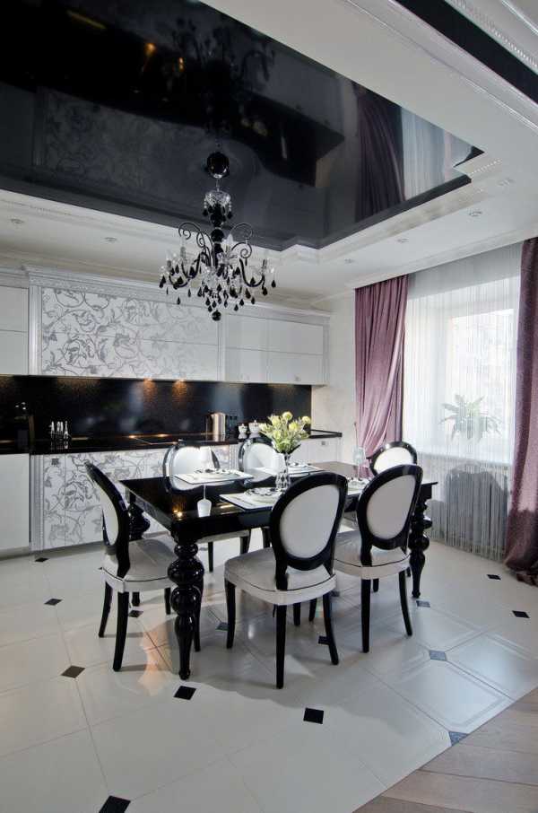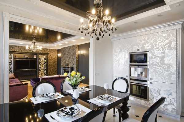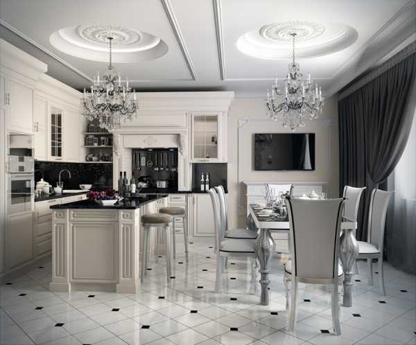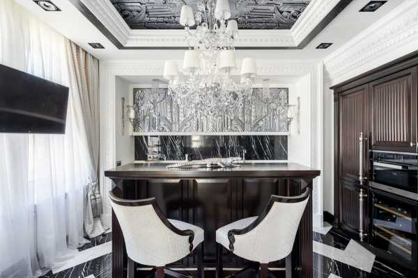 Планировка кухни отличается размахом и комфортом. Удачнее всего в интерьер вписывается гарнитур с островом. Классический дорогой паркет на полу заменяется черно-белой плиткой, выложенной в шахматном порядке, или контрастными ромбами. Обивка стульев выполняется из натуральной кожи. Для визуального увеличения пространства над барной стойкой размещается массивное зеркало в шикарной раме. С целью выделения обеденной и рабочей зон на потолке устраиваются перепады высоты, а на полу создается просторный подиум для стола и стульев. Основные черно-белые тона с небольшими вариациями позволяют гармонично вписать в интерьер кухонную технику со стальными или пластиковыми элементами.