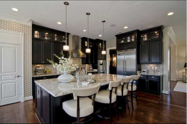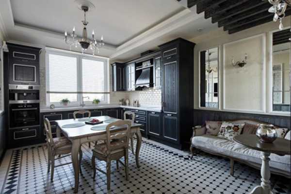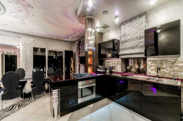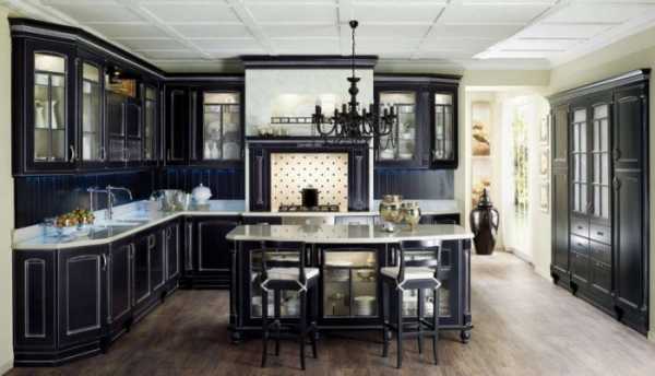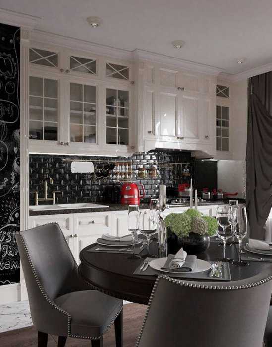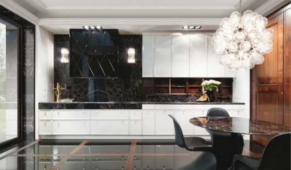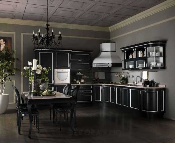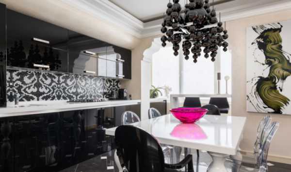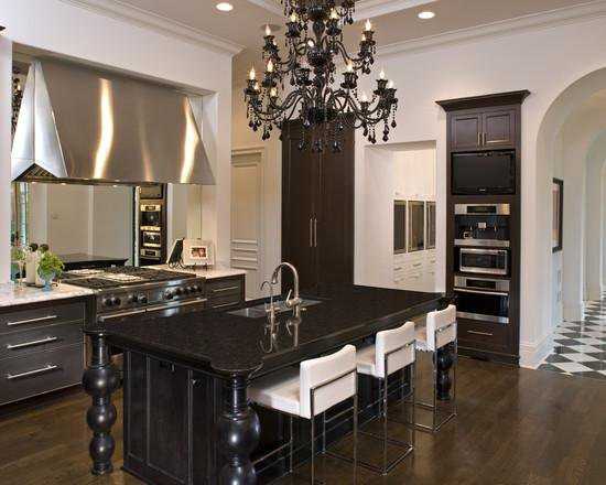 Глубокий ахроматический цвет в излишних количествах может смотреться довольно мрачно. Чтобы этого не произошло, необходимо наполнить интерьер зеркальными поверхностями, множеством стеклянных и хрустальных элементов, а также использовать в отделке глянец. Если выбор пал на темный гарнитур, то можно разбавить его фантазийной белой окантовкой. Контрастный пол на черной кухне придает интерьеру загадочности. Этот вариант оформления смотрится изысканно и эксклюзивно в просторных комнатах с достаточным освещением и светлыми декорациями.