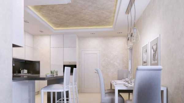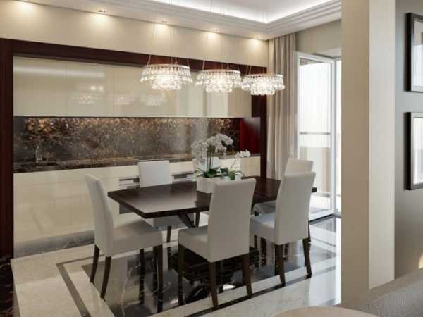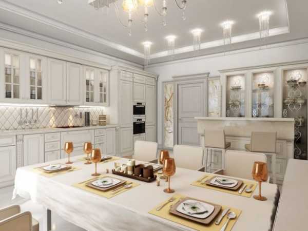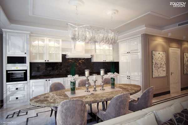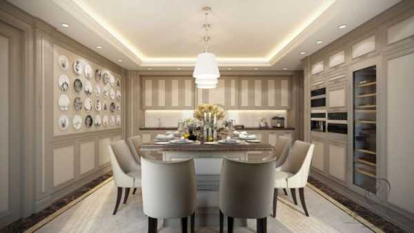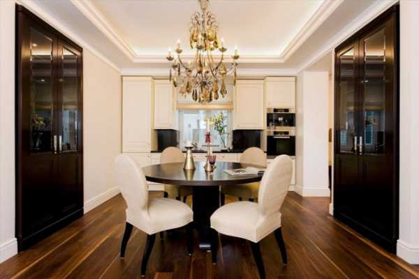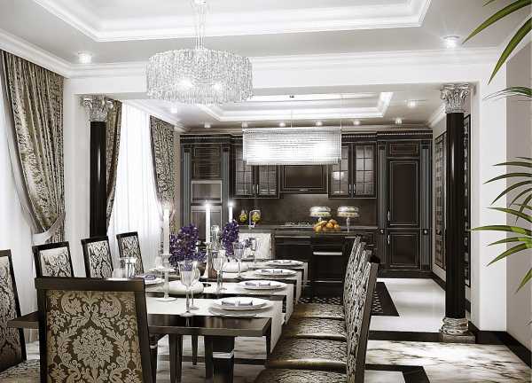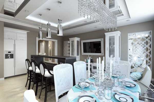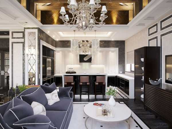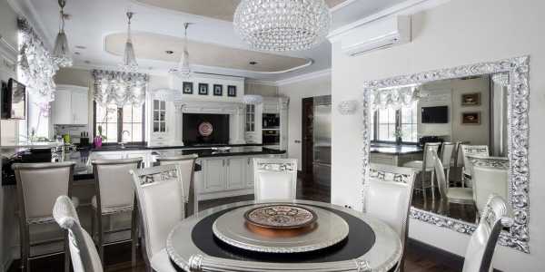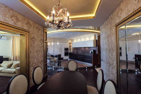 Этот стиль предполагает использование многоуровневого потолочного покрытия при выделении определенных зон. Например, над обеденной областью можно «утопить» квадратное пространство, оформив его в золотистом оттенке или сделав зеркальную вставку. Такая композиция подчеркнет красоту хрустальной люстры над столом.