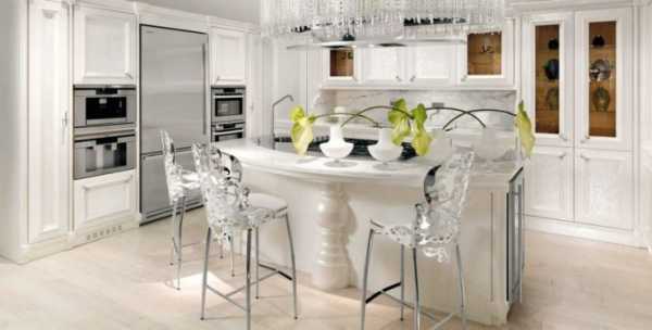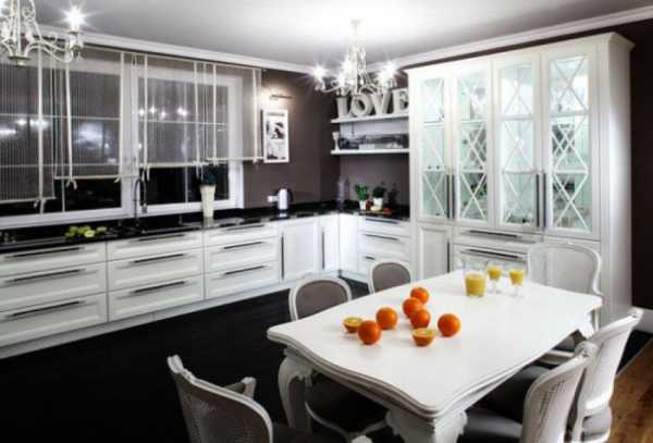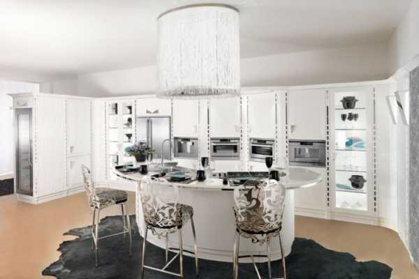 Обилие поверхностей, оформленных в оттенки белого, придает помещению больше простора. Светлый фон необходим для выделения роскошных предметов декора, позолоты и богатых узоров. Геометрические элементы черного цвета смотрятся в такой кухне ярко и контрастно. Вместо единого снежно-белого оттенка можно в некоторых местах использовать более приглушенные тона с серым, едва заметным голубым или бежевым подтоном. Этот прием позволит создать более деликатный вариант оформления кухни в стиле арт-деко. Белый гарнитур прекрасно сочетается с множеством серебристых и хрустальных декоративных деталей, создавая воздушную атмосферу.