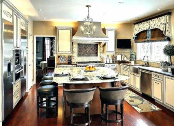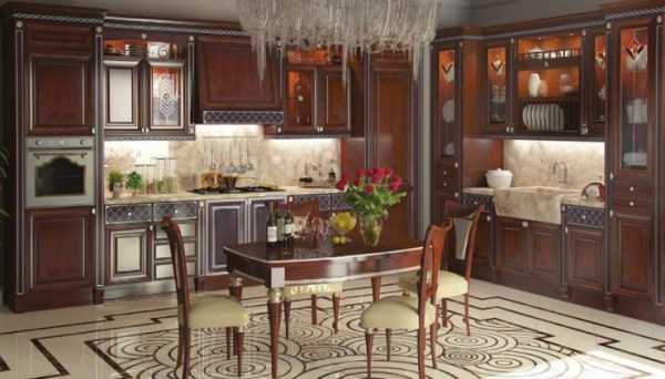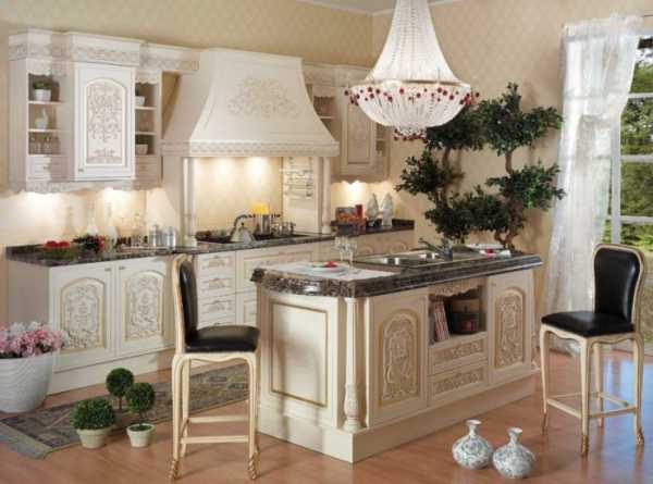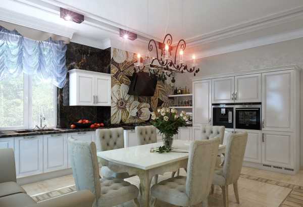 Стулья также должны быть выполнены в одном или двух цветах. Отлично впишутся в стиль изогнутые резные ножки с высокими трапециевидными или овальными спинками. Обеденный стол – это центр кухни, поэтому его размеры должны быть солидными, а в качестве материала лучше остановиться на темной породе дерева. Прекрасным украшением станет шелковая скатерть подходящей расцветки.