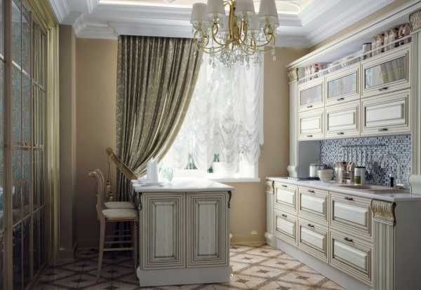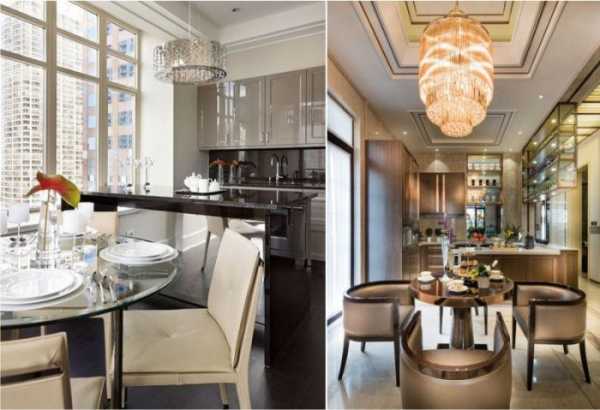 Люстра должна быть массивной и пафосной, с многочисленными элементами из хрусталя. Декор светильника можно дополнить кованым канделябром. Если на кухне высокий потолок, то прекрасным вариантом станет каскадная люстра с тонкими длинными нитями подвесок. Дополнительные источники света могут быть размещены по периметру зон, а также над зеркалами, фотографиями и картинами. Камерное освещение можно организовать, повесив на стене затейливое бра.