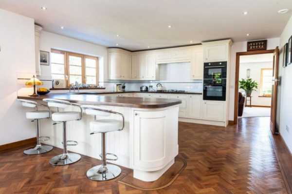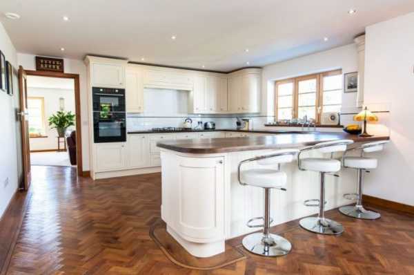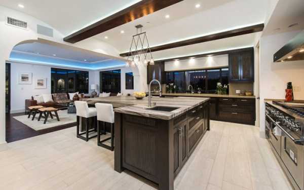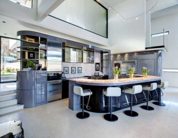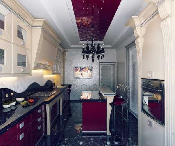 Если массивный кухонный гарнитур имеет три уровня и занимает всю стену до самого верха, то потолок в таком случае можно сделать плоским, чтобы не отвлекать внимание от роскошной мебели.