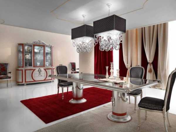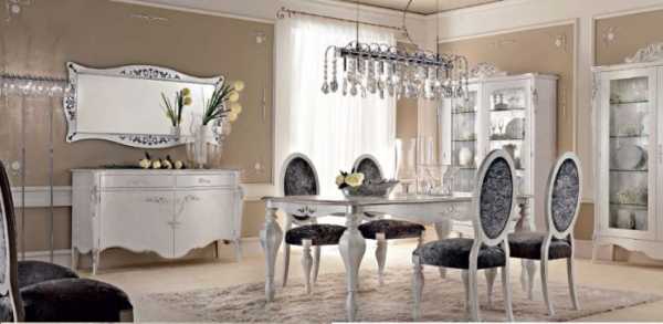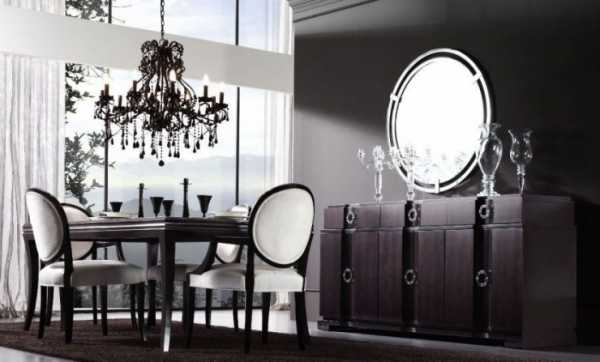 Дверцы украшают скобы со вставками или ручки-кнопки с перламутровыми пуговицами, латунная или бронзовая фурнитура. Комплект мебели удачно дополняет стол из прозрачного или черного стекла, отражающий блики солнца и люстры, стулья с блестящей атласной обивкой, кожей, замшей, велюром. Многие приобретают антикварную обеденную группу с полировкой и стулья в венецианском стиле.