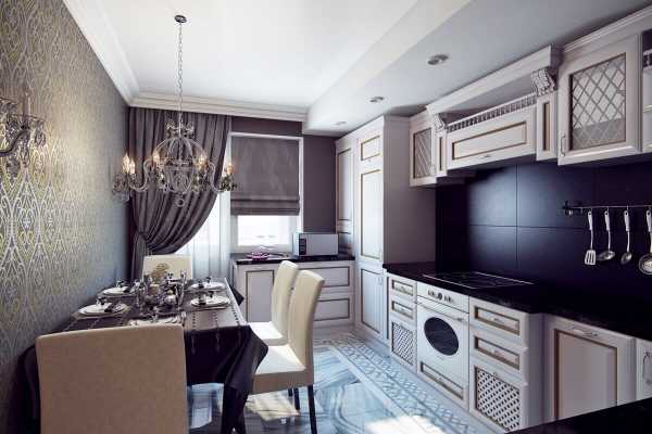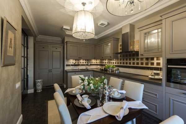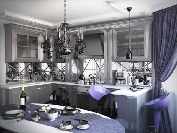 Благородный и спокойный пепельный цвет создает впечатление богатства и подчеркивает достоинства лепнины, дорогого текстиля, хрустальных подвесок и кованых черных элементов. С таким фоном прекрасно гармонирует мистический сиреневый цвет, в который можно оформить бархатные гардины, жаккардовую скатерть и барные стулья. Глубины помещению придаст зеркальный фартук.