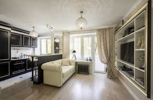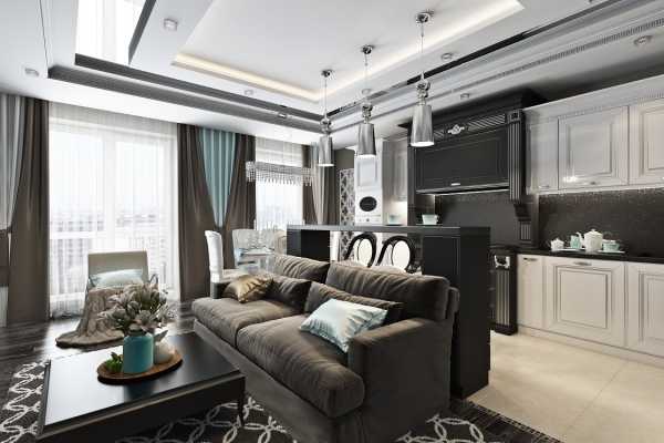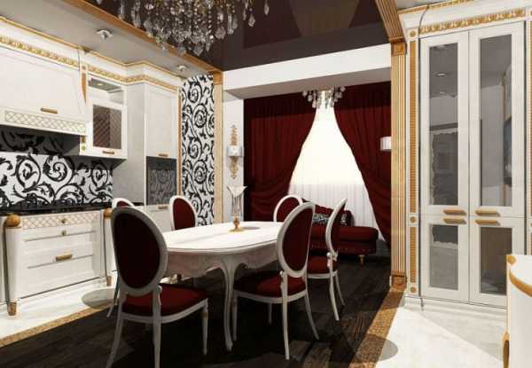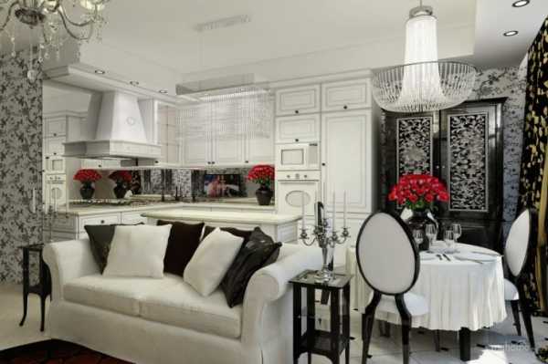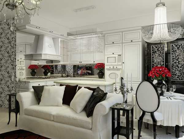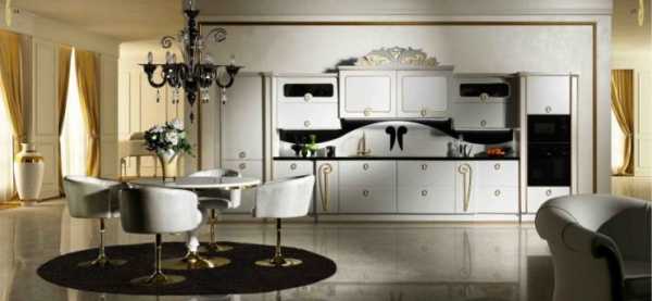При оформлении мебели в кухне-студии необходимо декорировать мягкий гарнитур каретной стяжкой. Этот прием применялся еще в царские времена для украшения сидений карет, а потому он ассоциируется с роскошью и богатством. В зоне отдыха можно расположить ковер ручной работы. Во всех предметах интерьера должны прослеживаться плавные линии: закругленные спинки, изогнутые ножки. Контрастными элементами на фоне светлой отделки стен станут домашний кинотеатр и стереосистема, оформленные в черном цвете.