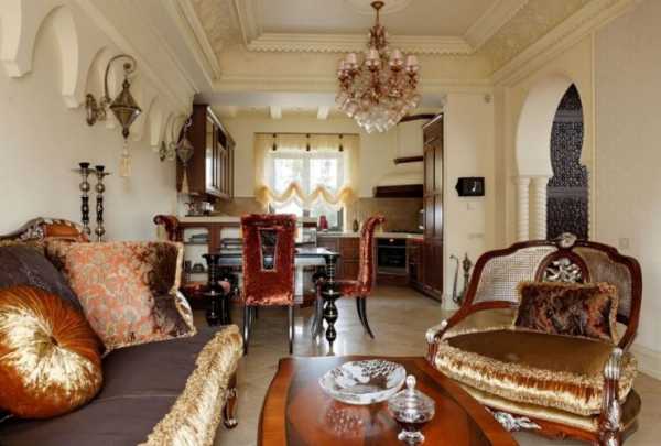 Формы и декоры нашли отражение в дизайнах потолков, пола, стен, мебели.