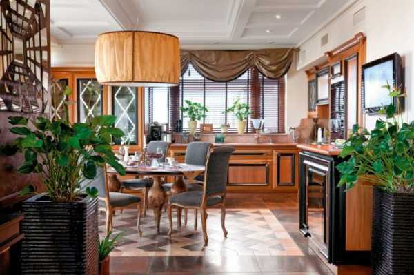 Драпировки на окнах соответствуют общей концепции дизайна. Бархатные шторы сочетают с прозрачными струящимися тканями. На подоконники ставят живые цветы. В столовой преобладают: