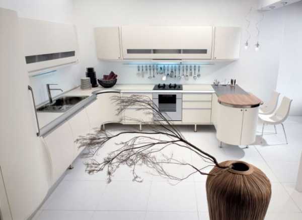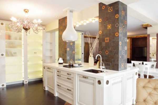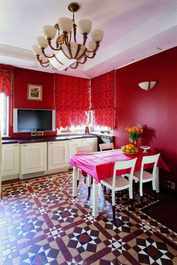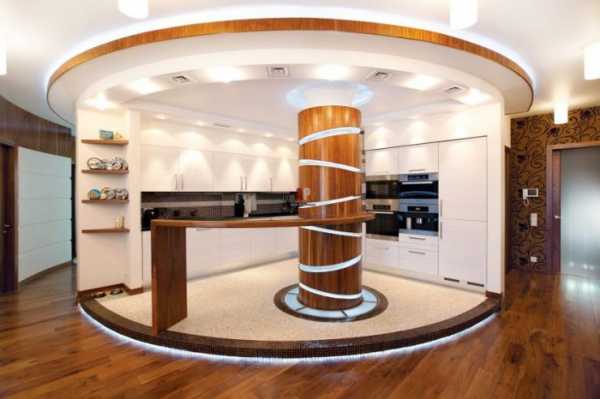 В эконом-варианте используют линолеум с имитацией плитки. Эффектно смотрится кухня с подиумом. Стоящая на светлом пьедестале обеденная группа на фоне темного мрамора или керамики придает комнате торжественности. Особенно, если по периметру подиума встроены точечные светильники, параллельно решающие проблему освещения в темное время суток.